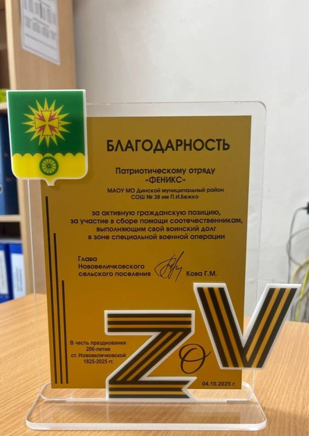 4 октября в честь двухсотлетия станицы Нововеличковской Краснодарского края патриотический клуб «ФЕНИКС - СОШ №38» получил награду за значительный вклад в патриотическое воспитание молодежи и участие в сборе помощи бойцам СВО. Благодарность вручила глава Нововеличковского сельского поселения Галина Кова.