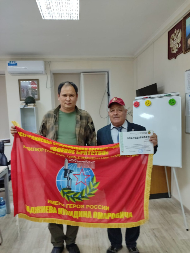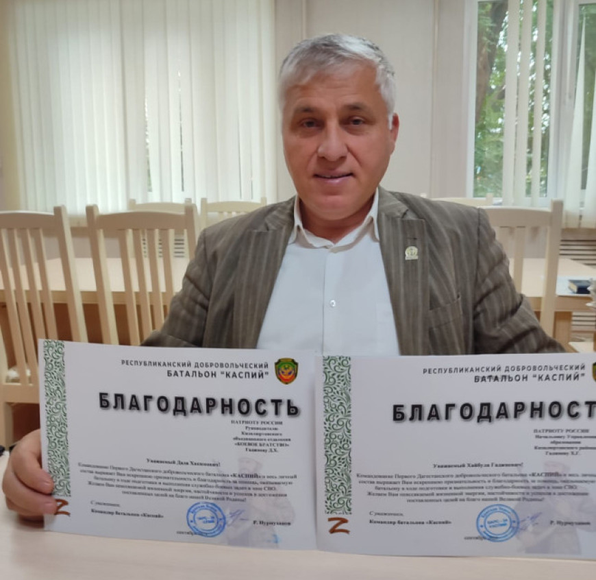 Руководитель Кизилюртовского объединенного отделения «БОЕВОГО БРАТСТВА» Дада Гаджиев и начальник Управления образования Кизилюртовского района Хайбулла Гаджиев за многократную доставку гуманитарных грузов для бойцов СВО дагестанского добровольческого отряда «Каспий» отмечены благодарностями командира отряда.