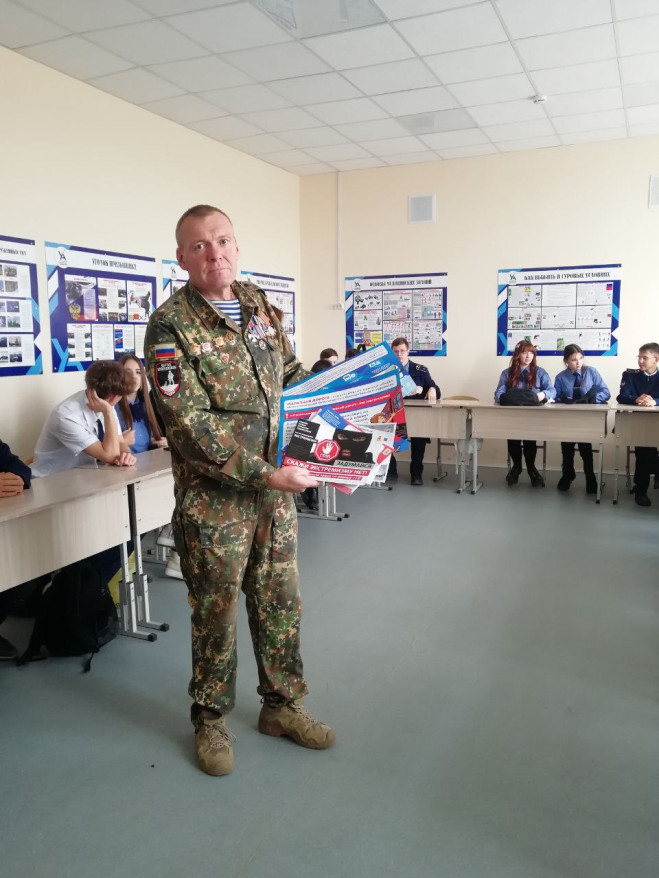На уроке ребята узнали о методах и приемах вербовки зарубежными спецслужбами молодых людей для совершения противоправных действий на территории России. Также обсудили обстановку в зоне СВО, подвиги воинов-земляков на фронте, трудности военной службы, работу волонтеров. Разобрали приемы западной пропаганды и переписывание истории.