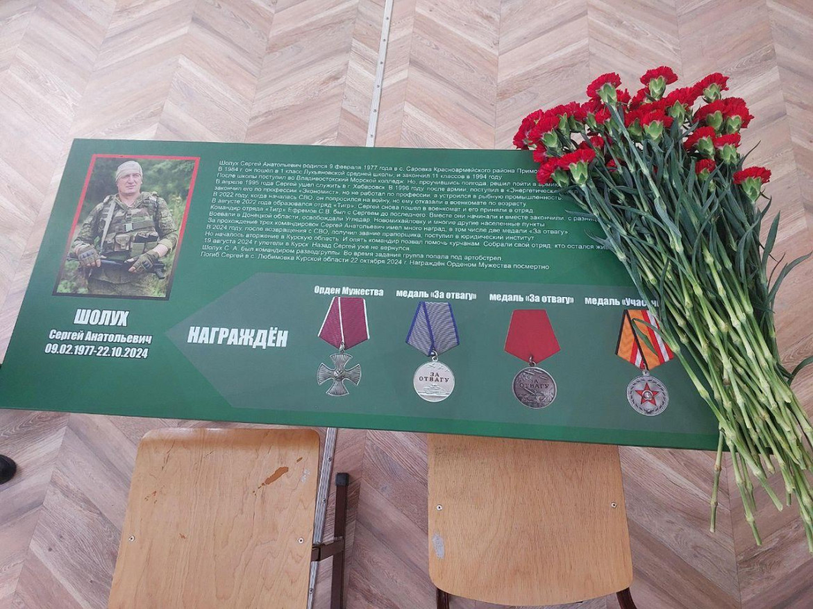 24 октября в школе села Лукьяновка Красноармейского муниципального округа Приморья состоялось торжественное мероприятие в честь открытия «Парты героя» выпускника Лукьяновской школы Сергея Шолуха, который проходил службу в отряде «Тигр» и погиб 22 октября 2024 года в с. Любимовка Курской области. Он награждён орденом Мужества посмертно.