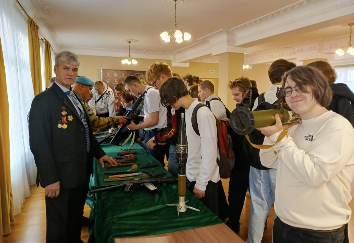 Председатель организации ветеран войны в Афганистане Роман Курбанов со своими воспитанниками из спортивной школы «Искра» и ветераны «БОЕВОГО БРАТСТВА» — ветеран войны в Афганистане Олег Бабушкин и ветераны боевых действий на Северном Кавказе Ильмур Якупов и Вадим Сайранов подготовили для студентов колледжа выставку военного вооружения и показательные выступления по панкратиону, исполнили патриотические песни под гитару.