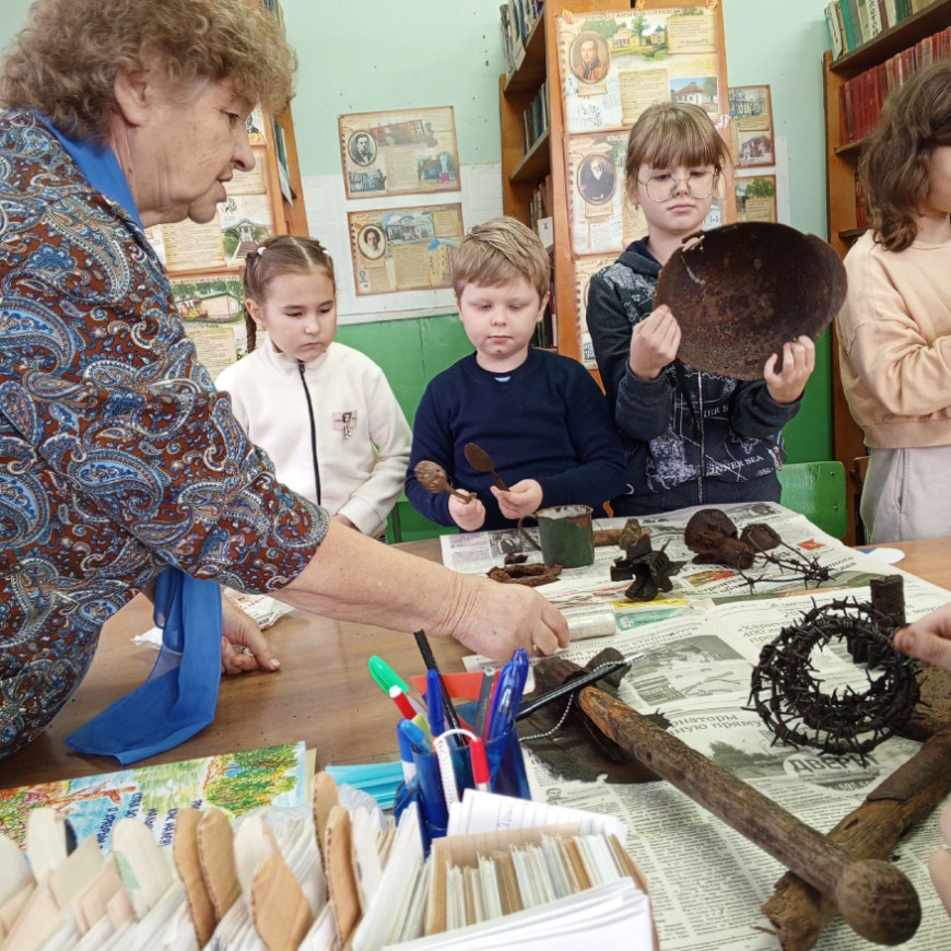 Перед ребятами выступила активистка поискового отряда «Путь воина» Вологодского “БОЕВОГО БРАТСТВА” Нина Маношина. Она участвовала в нескольких поисковых экспедициях на Синявинские болота в Ленинградскую область. Гость рассказала много интересного о событиях войны, воине-поэте С. Орлове, показала артефакты, найденные во время раскопок. Ребята ознакомились с предметами военных лет, которые пролежали в местах боёв в земле более 80 лет.