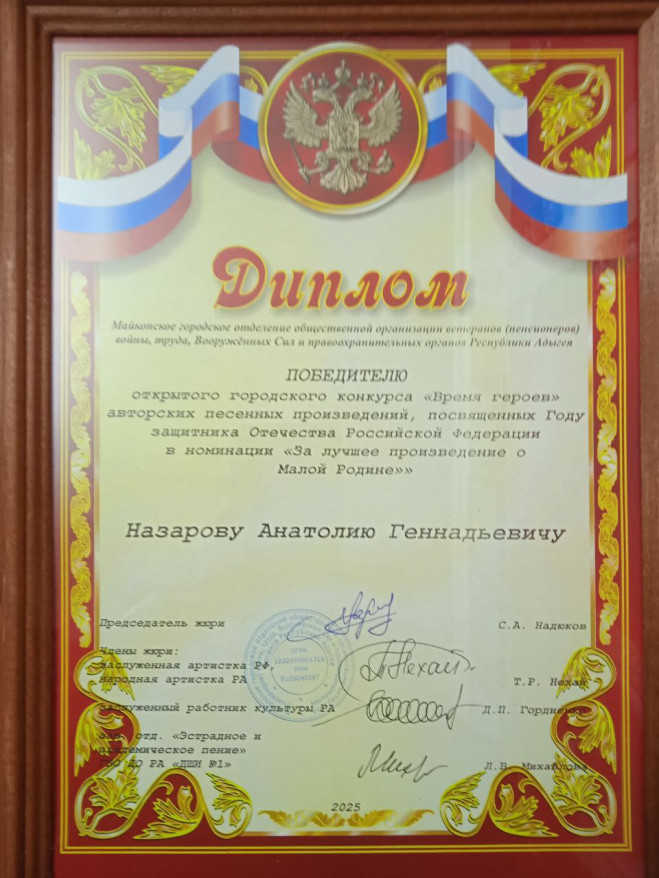 24 октября на мероприятии, посвящённом Дню ветерана Республики Адыгея, член Адыгейского отделения “БОЕВОГО БРАТСТВА” Анатолий Назаров получил диплом победителя в одной из номинаций открытого городского конкурса “Время героев”. Это конкурс авторских песенных произведений, посвящённых Году защитника Отечества.