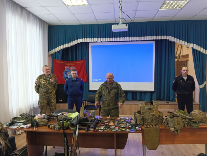 В рамках встречи ребятам была представлена выставка, на которой можно было увидеть различные образцы оружия, шевронов, военной амуниции и литературы. Особый интерес у студентов вызвали предметы, привезенные из зоны Специальной военной операции.