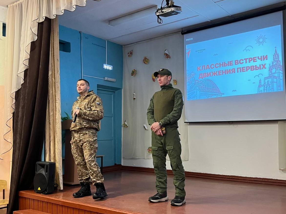 Ученики 9-11-х классов получили возможность пообщаться с настоящими героями нашего времени — участниками Специальной военной операции Максимом Асташенком и Сергеем Куликовым.