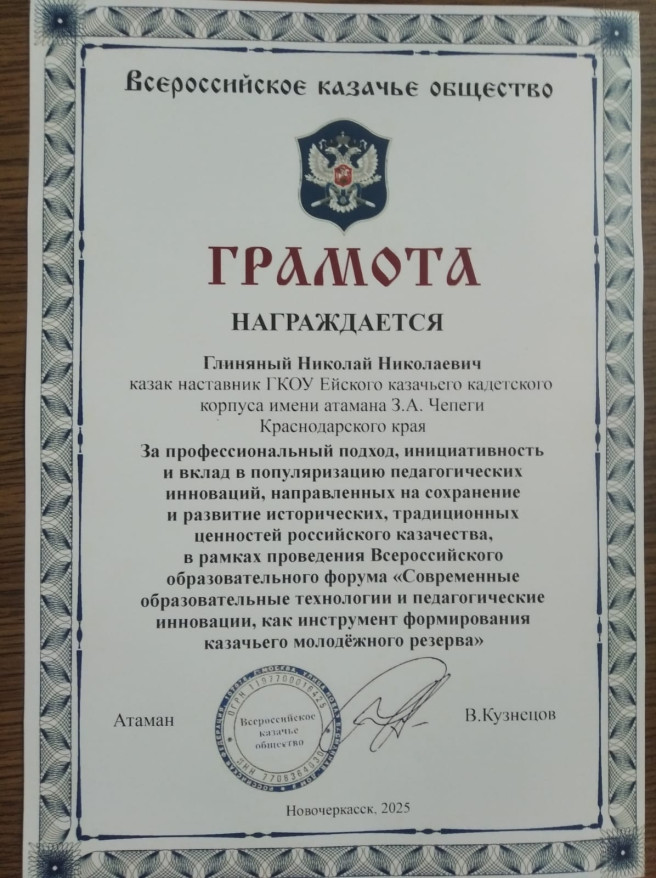 По итогам форума он награжден грамотой атамана Всероссийского казачьего общества Виталия Кузнецова.