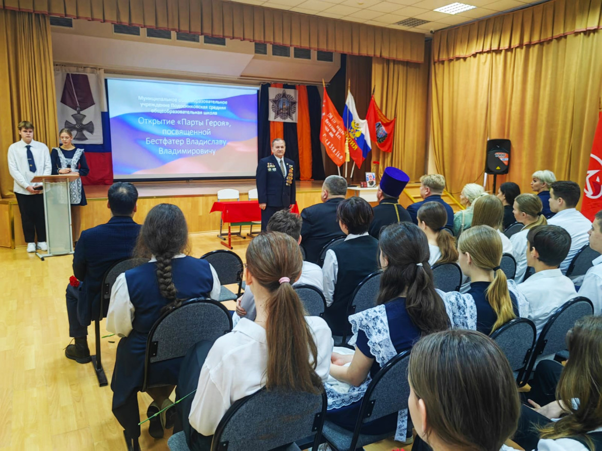 4 декабря в Подосинковской школе состоялось открытие “Парты героя”, посвящённой участнику СВО Бестфатеру Владиславу Владимировичу.