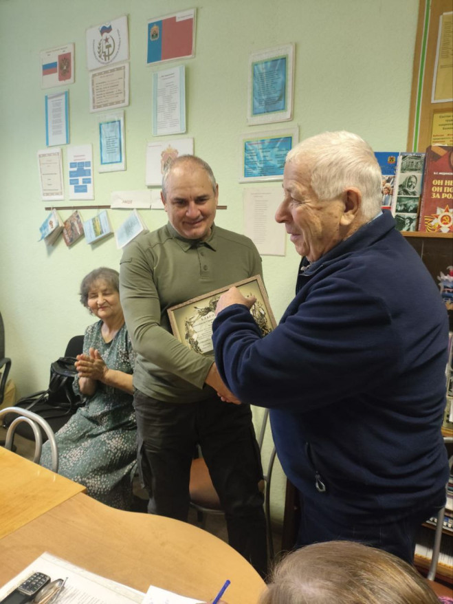 Николай Журавлёв выполнил поручение — вручил благодарственное письмо «за оказанную гуманитарную помощь военнослужащим, принимающим участие в Специальной военной операции» от командования ракетных войск и артиллерии группировки войск «Север» руководителю Совета ветеранов ОВД в Беловском округе Петру Вяткину.