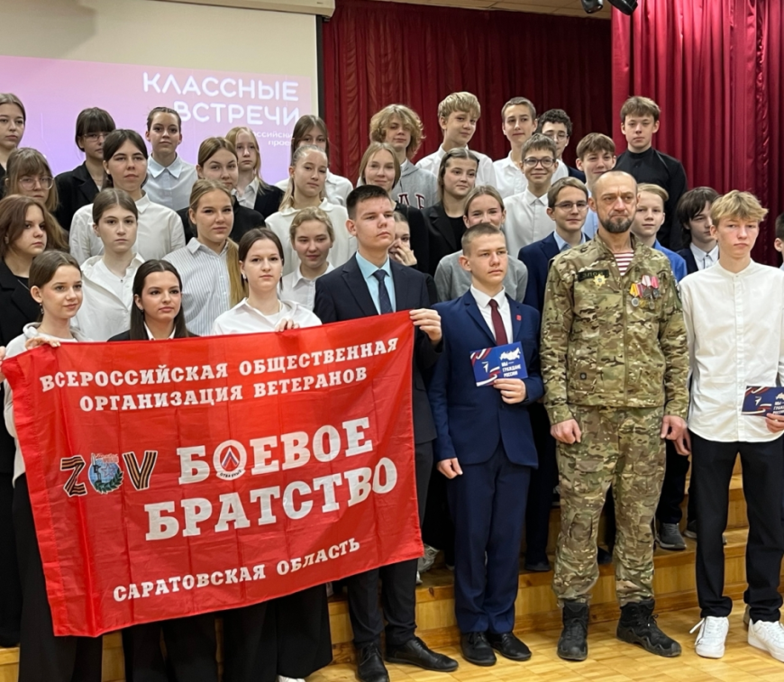 8 декабря в гимназия №2 Балакове прошел урок мужества с участником Специальной военной операции, членом Балаковского районного отделения «БОЕВОГО БРАТСТВА» имени В. Малярова Злобиным Алексеем.