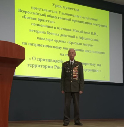 22 декабря представитель Ульяновского отделения «БОЕВОГО БРАТСТВА», ветеран боевых действий в Афганистане полковник в отставке В. Михайлов провел два урока мужества с учащимися Большенагаткинской школы.