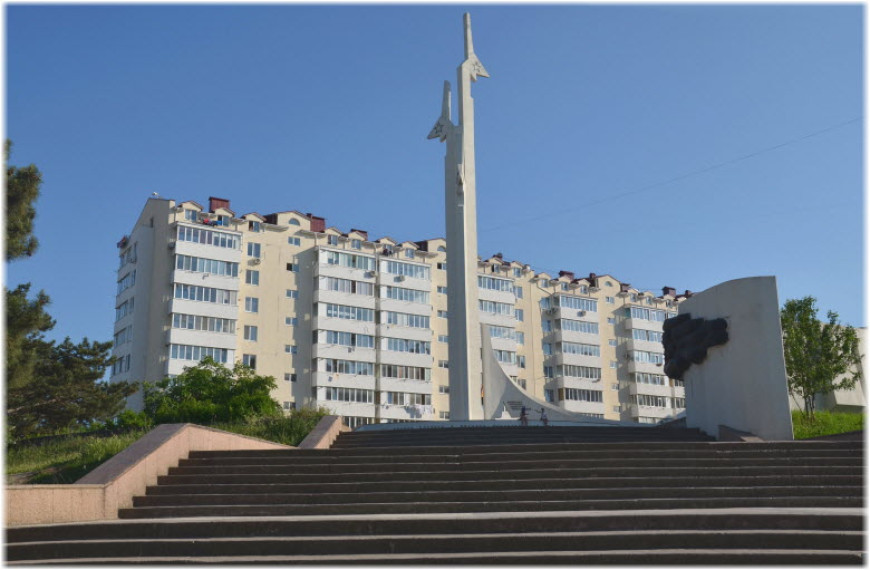 Центральная часть композиции — скульптура лётчика в полной экипировке, который смотрит вдаль, в сторону моря. Его фигура выражает готовность к бою и решимость. Рядом расположена стилизованная конструкция, напоминающая крыло самолёта или взлётную полосу, что символизирует небо и авиацию. На памятнике часто можно увидеть мемориальные плиты с именами погибших лётчиков и надписями, посвящёнными их подвигам. Композиция выполнена из бетона и металла, отличается лаконичностью и динамизмом.