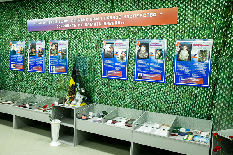 В ней представлены истории шести выпускников школы, погибших в зоне СВО. О каждом из них рассказывают личные вещи, бережно переданные семьями: фотографии разных лет, письма, личные вещи, форменное обмундирование. Это не просто витрины с предметами, это часть боевого пути тех, кто отдал свои жизни за Родину.