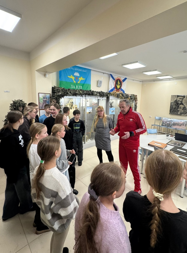 14 февраля в музее «Парк Победы» Череповца для учеников 5-го класса «Юнармия» школы №4 прошли урок мужества и экскурсия. Член совета Вологодского «БОЕВОГО БРАТСТВА» Геннадий Малышев и научный сотрудник музея М. Экман ознакомили юных череповчан с экспозицией музея, посвященной Специальной военной операции.