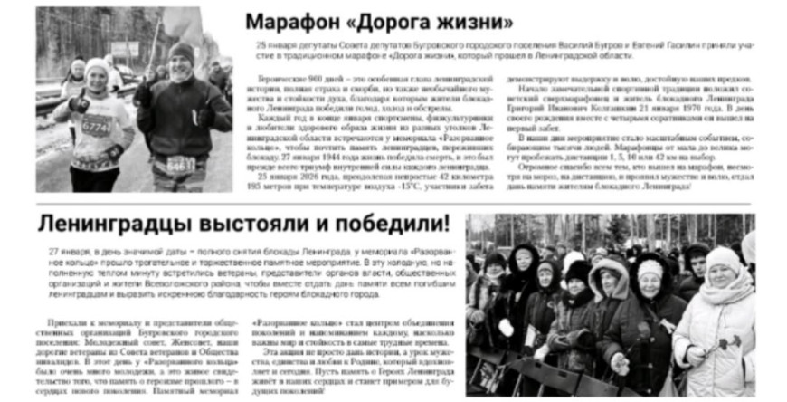 В статье рассказано об участии ветерана Василия Бугрова в памятном марафоне “Дорога жизни”, посвященном годовщине полного снятия блокады Ленинграда.