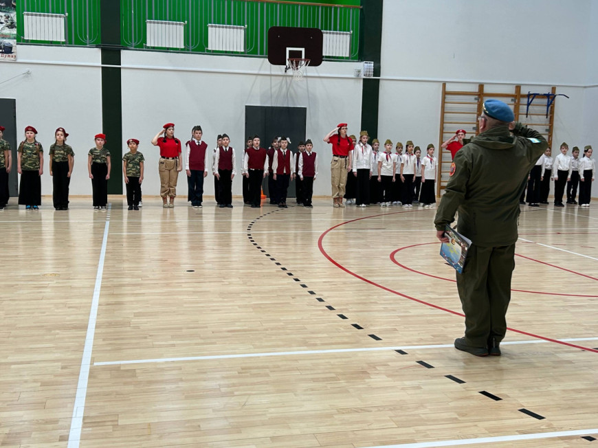 Мероприятие началось со смотра строя и песни. Юнармейцы школьного отряда помогали в подготовке, ученики младших классов прошли перед болельщиками и родителями строем и исполнили песни.