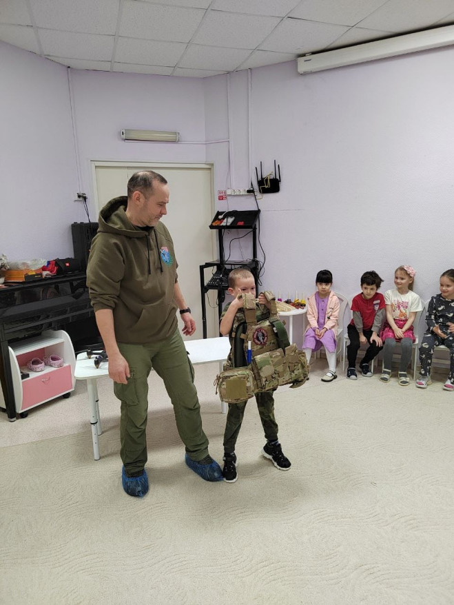 На встрече ребятам представилась возможность примерить на себя экипировку современного бойца.