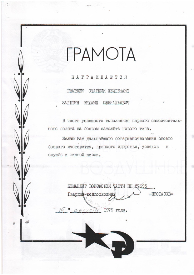 Московское суворовское училище он окончил в 1971 году. Затем вместе с тремя друзьями, которые, как и он, хотели быть летчиками, поехал в Чернигов в летное училище. Подготовка у летчиков была серьезная. Надо было осваивать сложное оборудование, уметь им управлять. Первые два года учеба несильно отличалась от институтской по техническому профилю, изучали, как говорит Михаил Ювенальевич, «высшую математику и прочие сопроматы». Первый самостоятельный вылет Михаилу Залетину запомнился особенно. У каждого летчика этот момент остается в памяти. Вспоминает он и первый раз испытанную перегрузку.