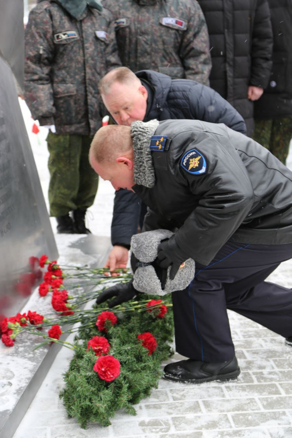 После информационного доклада и произнесённых речей состоялось возложение цветов к памятнику и минута молчания.