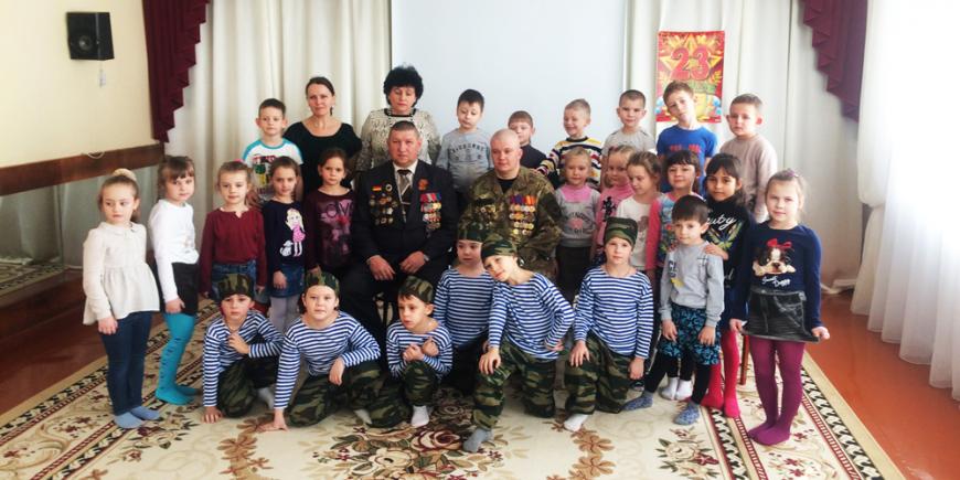 С.А. Клочковым и С.А. Псёл. Ветераны боевых действий рассказали детям, что такое патриотизм. Какие рода войск существуют, где они воюют. В заключении дети показали небольшой концерт и подарили рисунки и цветы.